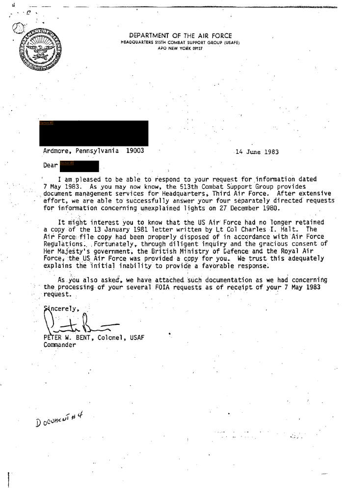 The book was designed to get responses from others and in it, I had to lay it all on the table, for better or worse. Further to the spook stuff I can say that the Russians, and MOSSAD have had an interest in this affair. Unnerving.(P11) The stuff about my family is dead right!(P12)Jimmy Carter was not on the base at all although I was told the pres, knew about Bentwaters, more like incoming vp Bush sr, the carter thing comes from my problem of starting a sentence and then skipping to another subject. This is due to a head injury I sustained in 1984 and its weird to see that happen in a transcript, I saw Carter that year ‘86 at central Connecticut state university, and that was what I was going to say. All that know me know I have that issue, so sorry folks, no Jimmy Carter in the underground base! Well Linda I’m sure I’ve missed something or other, my book is my statement, there are errors in it but it’s the best I can do. Please remember that the tabloid News of the world is a rag, the quotes attributed to me, Halt and Williams were invented to sell papers, that is one of my biggest regrets with this thing is when CAUSE sent the halt memo to the UK to help certain researchers out, it was sold on to that paper for 25000 pounds by a lawyer, cause and myself had nothing to do with it and it put the case on shit street right out of the gate, those quotes ARE NOT MINE, and use words only English people use! I know as I live in England, don’t believe any of that coverage from 83 its crap and sensationalized an event that didn’t need it. I hope they spent the money well? One last thing, Linda as you know, I know that you have no ill will towards me, and now we go back to intentional misrepresentation of me and un intentional misrepresentation, lets take a look at science writer Ian Ridpath’s website, where he uses a letter I wrote home to my mother trying to fill in the phone conversation with her about the ufo that I got cut off on. I try to be a bit James Bond and identify myself as a guy I know on D flight. Also I end the letter with this, “Ma, I will tell you the whole thing on the ufo , I cant in the mail cause they read it!” Ian uses another sighting of lights earlier that night to match his lighthouse, stars, satellites theory and omits key points in my letter, intentional? I think so, with Malice? I think not. That letter predates Col Halts by a week by the way, so if I’m lying, my mom was my first mark , think about it people. Now for state sponsored this, and this wont win me some buddies but I got plenty thanks, this is part of an email that was sent to Peter Robbins in late 1999, Peter sent it on to me and this is it;